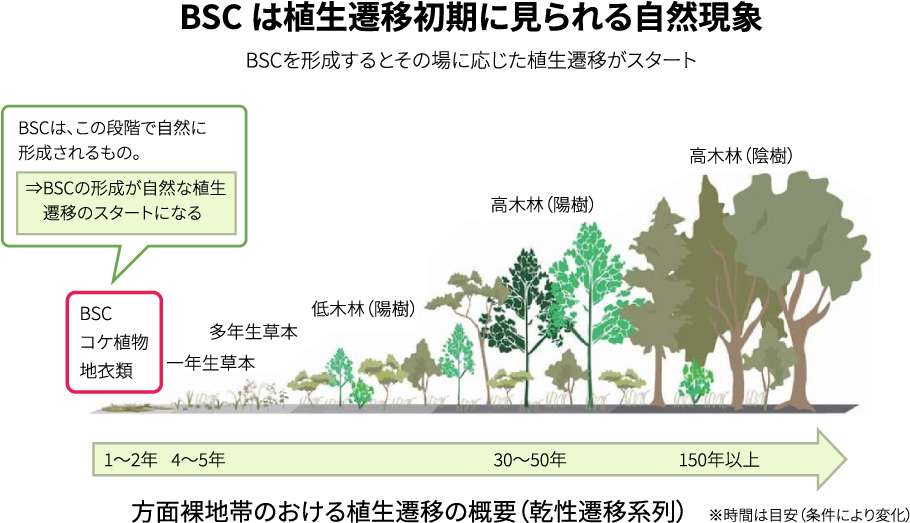 ※BSCを形成する土壌藻類等は植生遷移の初期に侵入するパイオニア